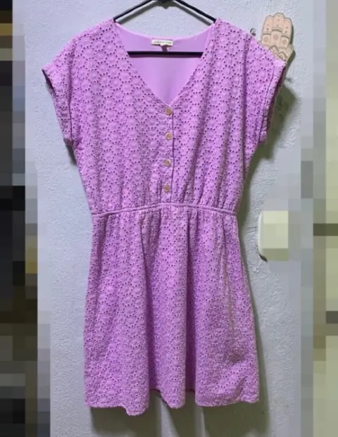 Vestido de encaje lila. Vestido de encaje con fondo color lila con botones al frente que se pueden abrir, elástico en cintura.Producto importado 🇺🇸Material: 100% algodón Forro 100% poliéster Medidas: Largo 88 cm Cintura 36 cmEstira hasta 52 cm Pecho (axila a axila) 55cm