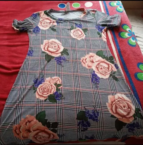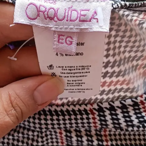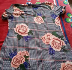 Vestido de estampado tartan c/flores. Vestido midi con estampado de flores, talla EG, manga corta, 96% poliester, 4% elastano, sin estrenar, cuello redondo. Medidas: Largo: 90cm, pecho: 98cm, cadera 117cm, largo manga 9.5cm, biceps 41cm.