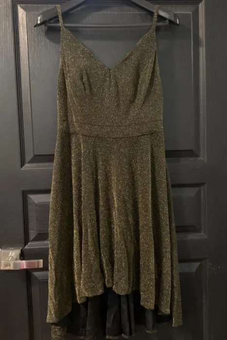 Vestido de fiesta. Vestido dorado, corto y asimétrico, corto de adelante y largo de atrás con tirantes, talla 8