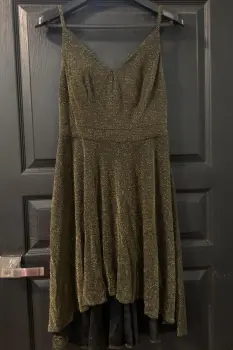 Vestido dorado, corto y asimétrico, corto de adelante y largo de atrás con tirantes, talla 8