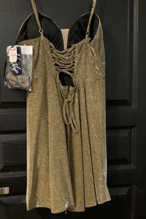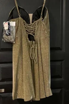 Vestido de fiesta dorado corto, talla G. Nuevo