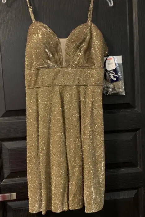 Vestido de fiesta. Vestido de fiesta dorado corto, talla G. Nuevo