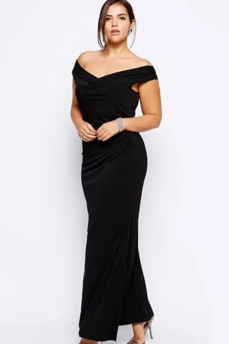 HERMOSO VESTIDO ENTALLADO, CON LOS HOMBROS SEMIDESCUBIERTOS, ELEGANTE Y SOFISTICADO.