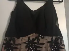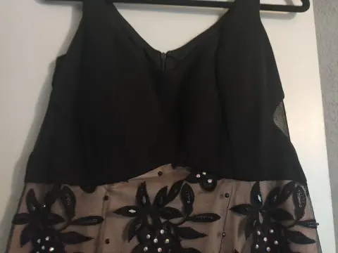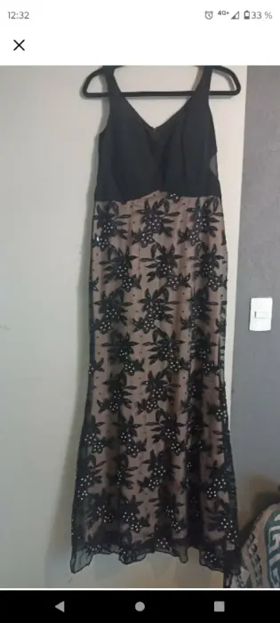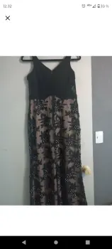 Bonito vestido de fiesta con detallez de pedreria de suaroski en tornasol en las flores (ese detalle fue agregado al vestido, asi ya no tiene una que otra piedrita) fondo color beige detalles en los laterales de maya transparente y se amoldea muy bien a tu figura. Solo se uso una vez