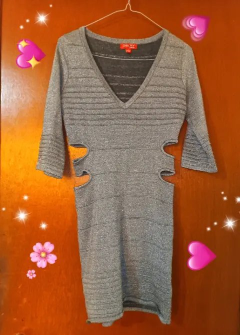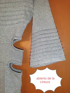 Vestido con abertura de ambos lados en la cintura color tela brillante plateado queda arriba de la rodilla y depende de la conflexion de la persona
