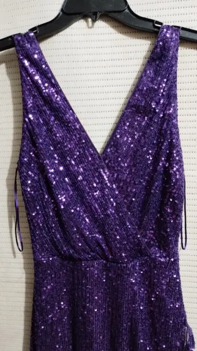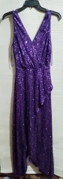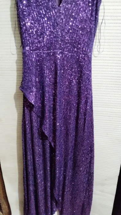 Vestido de fiesta. Vestido de lentejuelas, manga sisa , escote v. Asimétrico. Es pegadito de el talle y con cauda en caderas .
