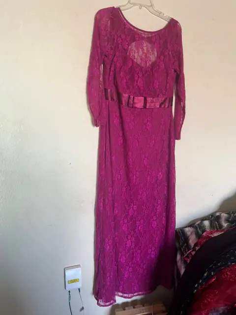 VESTIDO DE FIESTALARGO, DE ENCAJE CON FORRO DE LICRA, LIGERO, COLOR FUCSIA, DETALLE DE LISTÓN Y MOÑO AL FRENTE