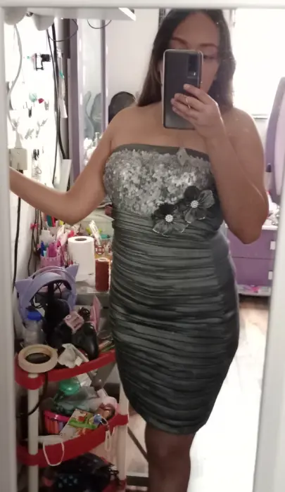 Vestido de fiesta. Vestido corto, color plata con una flor y lentejuela, en perfectas condiciones