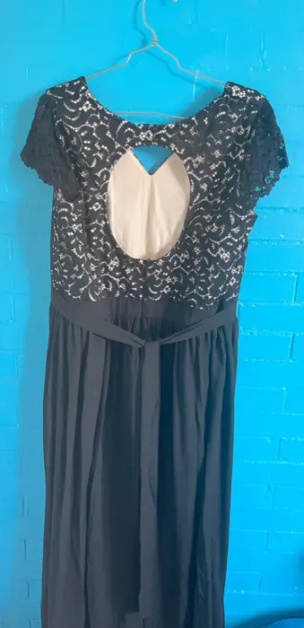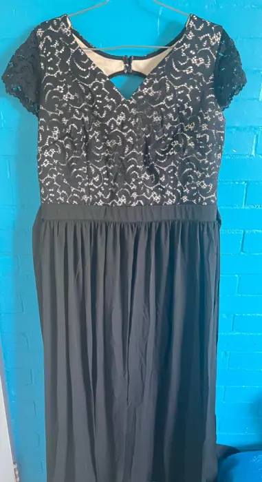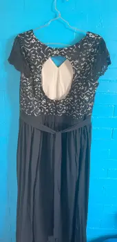 Vestido de fiesta. Vestido de fiesta negro, largo con encaje y escote circular en la espalda y jaretas para amarrar y hacer un moño tela poliéster.