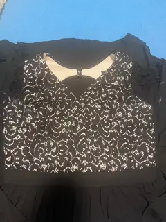 Vestido de fiesta negro, largo con encaje y escote circular en la espalda y jaretas para amarrar y hacer un moño tela poliéster.