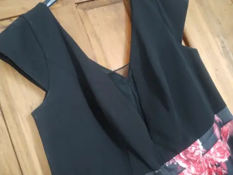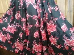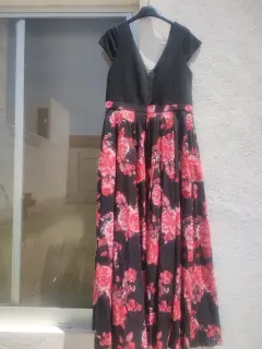 Negro con rosas rojas, falda amplia con una abertura a un lado, cuello y espalda en v, cierre en la parte de atrás, largo acomoda muy bien