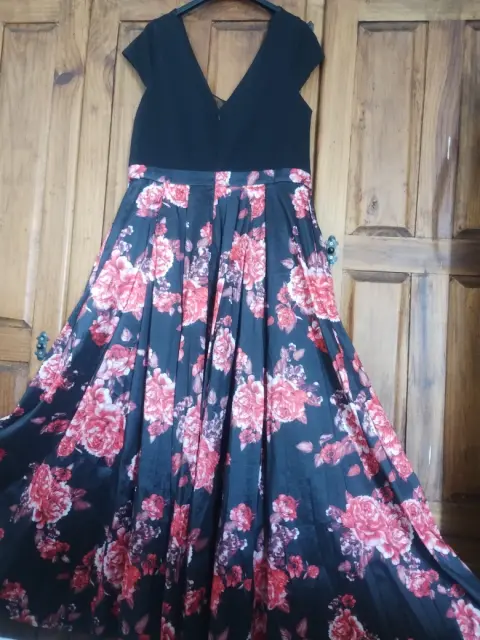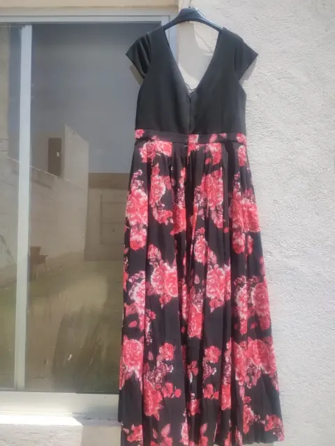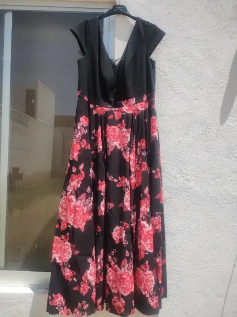 Vestido de fiesta. Negro con rosas rojas, falda amplia con una abertura a un lado, cuello y espalda en v, cierre en la parte de atrás, largo acomoda muy bien