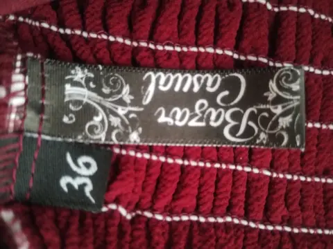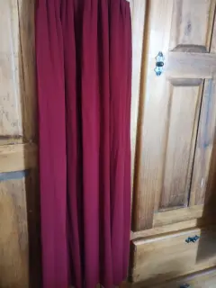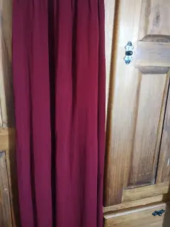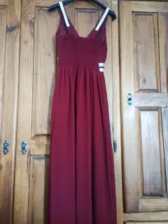 Largo, color guinda con aplicaciones con brillo en tirantes y cintura, cuello y espalda en v