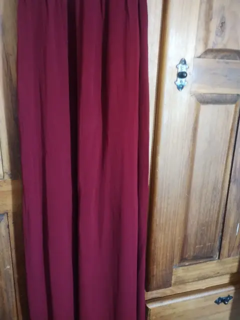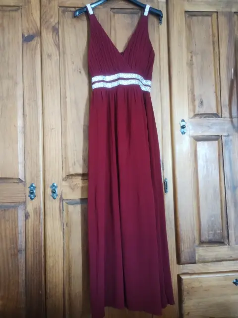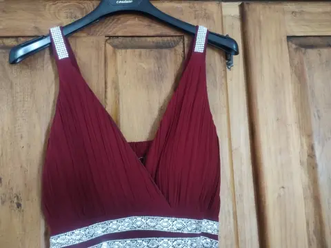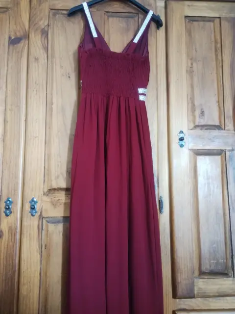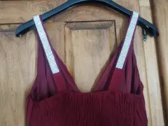 Vestido de fiesta. Largo, color guinda con aplicaciones con brillo en tirantes y cintura, cuello y espalda en v