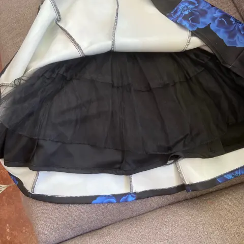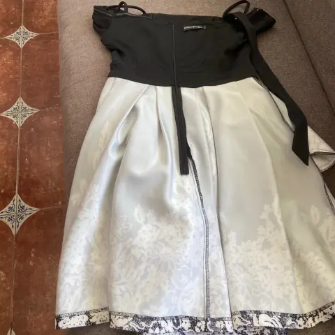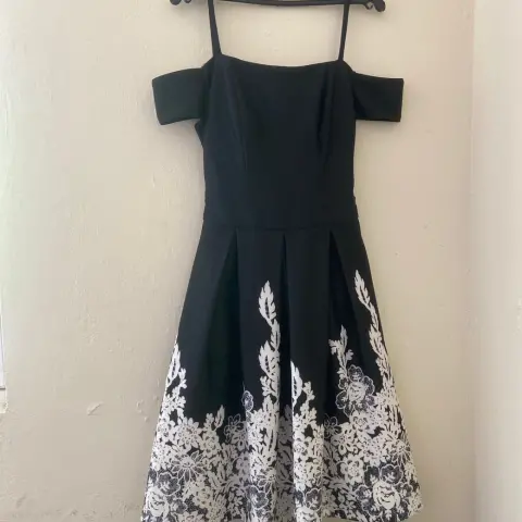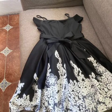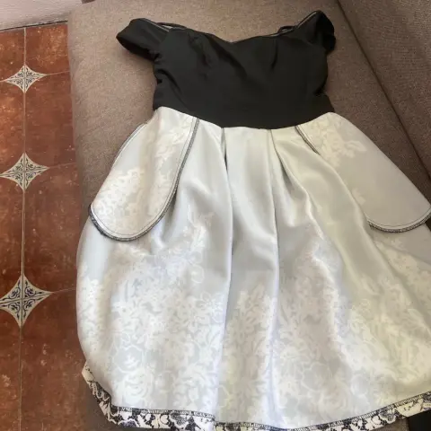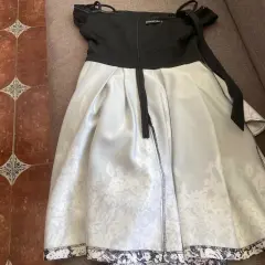 Hermoso vestido de fiesta negro con detalles blancos, con moño y aplicación de busto.Sin ningún detalle solo se utilizó 2 vecesDice XL pero queda desde una M, L