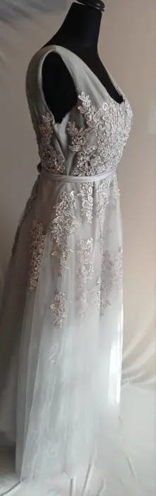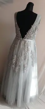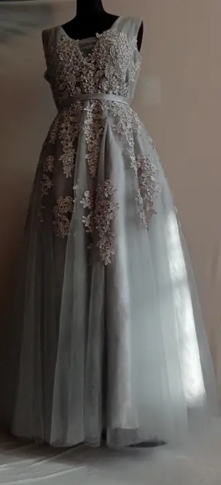 Vestido de fiesta. Vestido gris de fiesta, unitalla pero abarcar de talla mediana a grande. Tiene detalles en la parte superior del vestido y una abierta en la pierna está en excelente estado