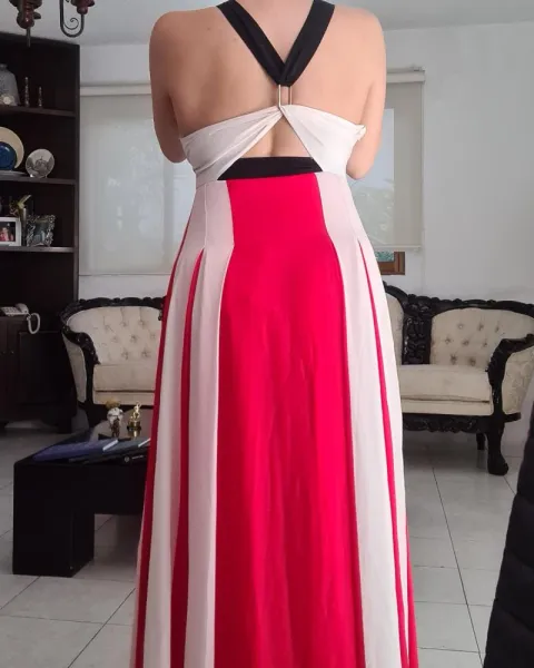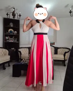 Vestido largo de fiesta. Es de tela muy ligera por lo que lo hace ideal para primavera.Medidas: de axila a axila 41 cm, el cinto negro son 38 cm y dr largo 118 cm.