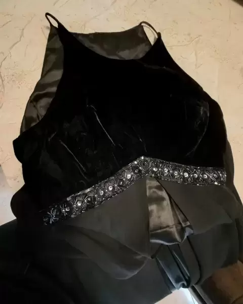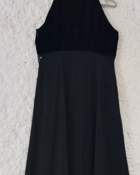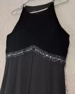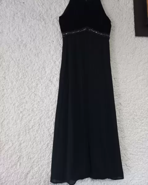 Vestido largo de fiesta, negro de terciopelo en la parte del torso y gasa con forro en la parte de abajo, arriba de la cintura tiene una franja de chaquira y lentejuela.Es muy elegante y hace bonita figura.