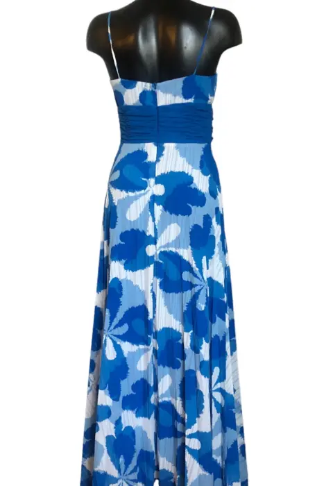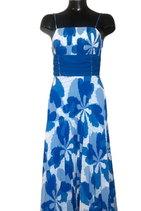 VESTIDO DE FIESTA. HERMOSO Y FRESCO TIENE 2 DETALLES FOTO(3 Y 4) EL FORRO TIENE DOS PEQUEÑOS JALONES DE HILO CASI NO SE NOTA Y EN LA PARTE TRASERA TIENE UNA MANCHA DE TINTA QUE NO SE PUEDE QUITAR NI EN TINTORERIA PERO CASI NO SE NOTABUSTO 96CINTURA 72TIRANTE 39LARGO FALDA 113