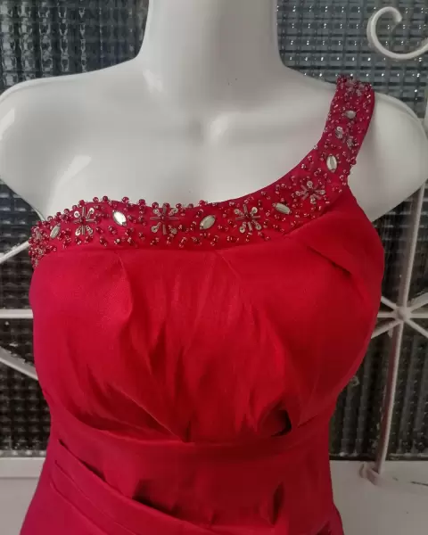 Vestido de fiesta straple con un tiranteCon pedreria de adornoPlisado que te disimula la pancitaTalla: 9Medidas: *De axila a axila 39 cm*Largo desde el pecho 80 cmTrae fondo y copasCupón: JanMoPBn0H