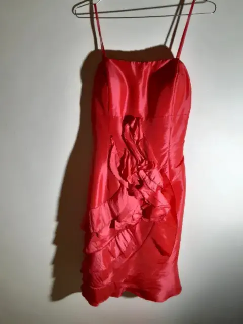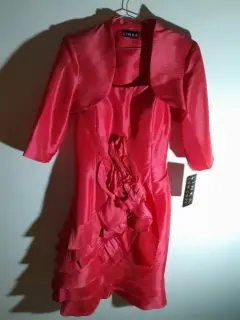 Vestido de fiesta corto, sin manga, con pequeño saco para cubrir los hombros.Color fresa.Nuevo, con etiqueta.Talla 14