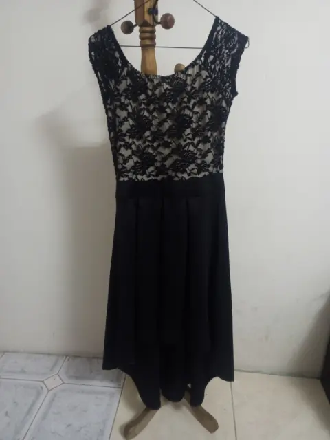 Vestido negro con encaje. En la parte de abrriba escaje negro y fondo beige, en la parte de abajo falda negra con cola de pato, ideal para fiesta.