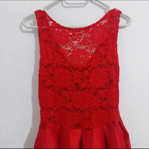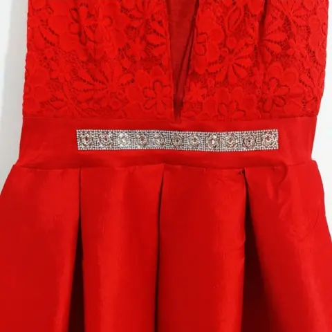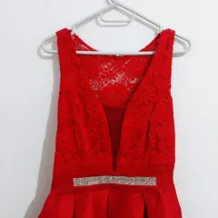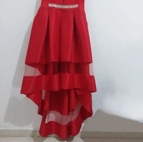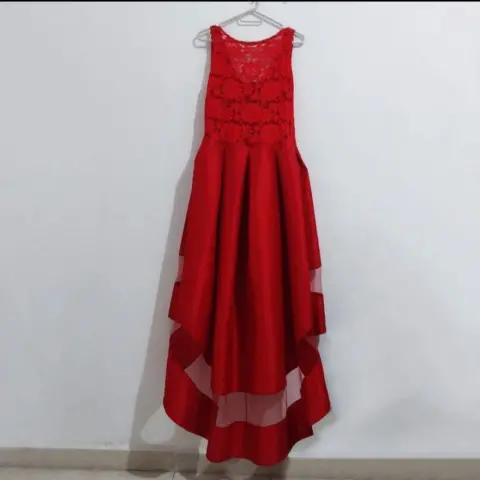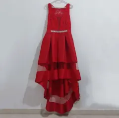 Vestido con cauda semitransparente color rojo con aplicación en la cintura, la parte superior es de encaje y tiene una transparencia en la cauda.