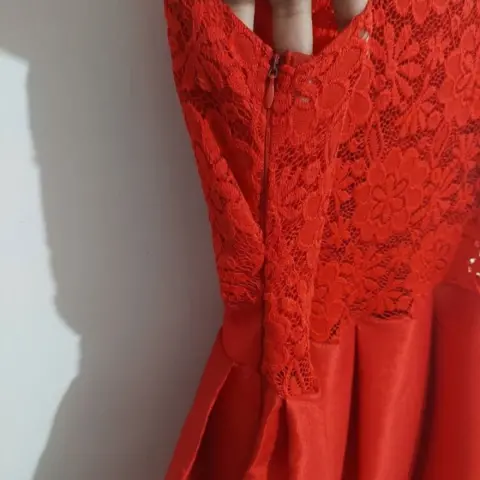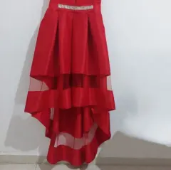 Vestido de fiesta con cauda. Vestido con cauda semitransparente color rojo con aplicación en la cintura, la parte superior es de encaje y tiene una transparencia en la cauda.
