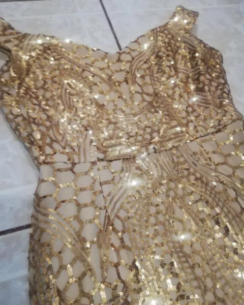 Vestido de fiesta dorado. Color dorado con lentejuela, estraples, forma sirena, largo y se ajusta bonito