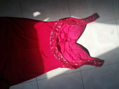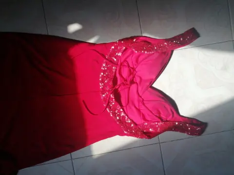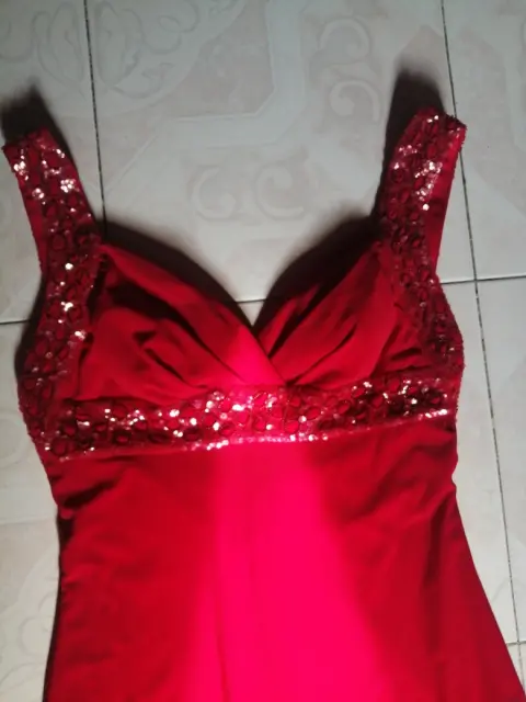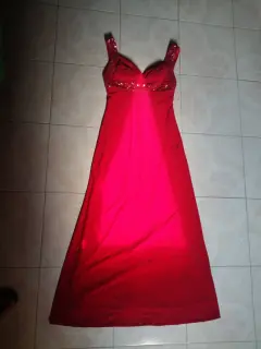 Vestido en color rojo confeccionado en tela poliester con elastano, con bordado con lentejuelas en vista del busto y hombros, verdaderamente elegante.