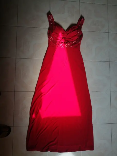 Vestido de fiesta largo.. Vestido en color rojo confeccionado en tela poliester con elastano, con bordado con lentejuelas en vista del busto y hombros, verdaderamente elegante.