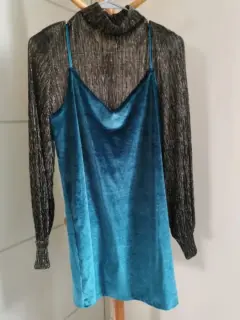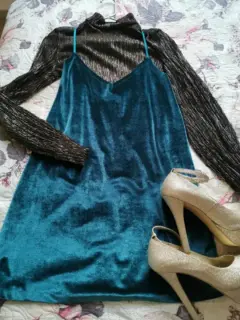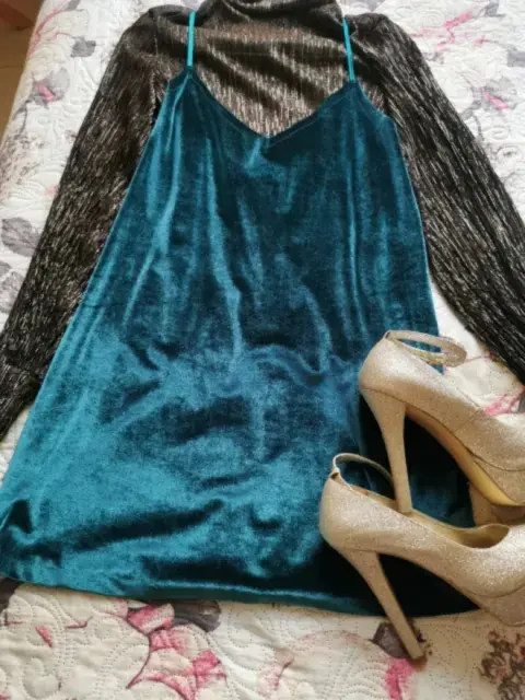 Vestido de fiesta velvet con finos tirantes, talla mediana, color azul verde 💥