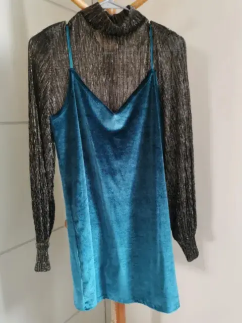 Vestido de fiesta (Pull&Bear) 💥. Vestido de fiesta velvet con finos tirantes, talla mediana, color azul verde 💥
