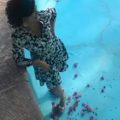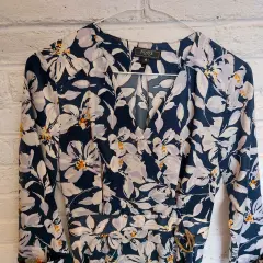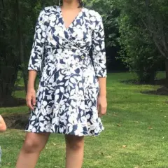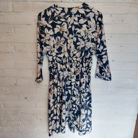 Vestido de flores blancas con azulAcinturado con cinturón y hebillasArriba de la rodillaTela suaveTalla 4Puesto una vez