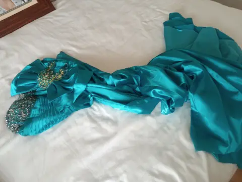 Vestido de gala Azul con pedrería. Hermoso vestido largo con incrustación de piedras en el busto un moño, y abertura lateral