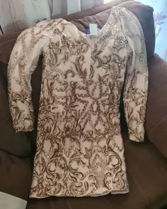 Bonito vestido de fiesta en tono nude con diseños en lentejuela color rose gold, totalmente nuevo solo arrugado de estar guardado, marca coCoa d'honor