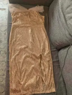Vestido de lentejuelas doradas. Hermoso vestido color champaña con lentejuelas doradas, de tirantes ajustables y manga caída de tul, trae forro y cierre oculto