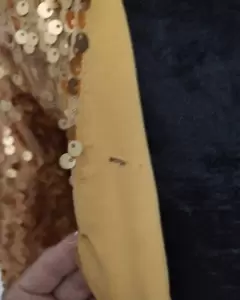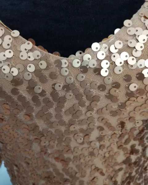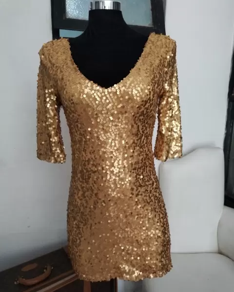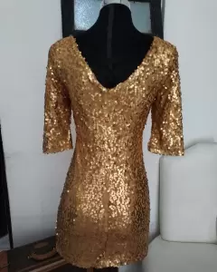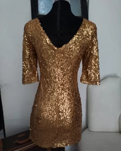 Vestido corto CH-M de lentejuela dorada, la tela da un poco de si para lograr una hermosa figura, tiene un detalle en el forro interior, un pequeño agujero por arrancar mal la etiqueta( no se nota por fuera).