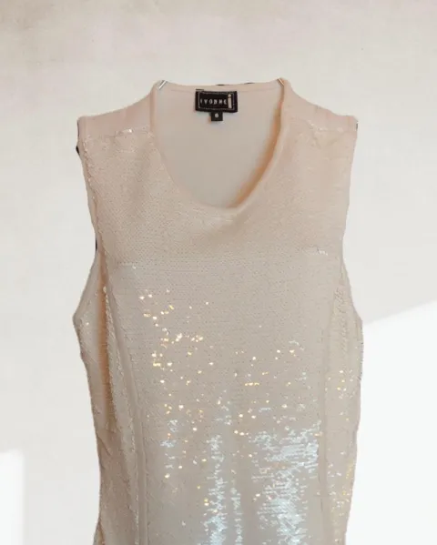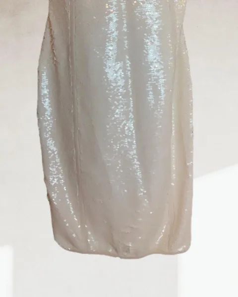 Vestido en lentejuelas color blanco, bellísima caída es liso por la parte de atrás, sin magas ¡que no te lo ganen! 🤩