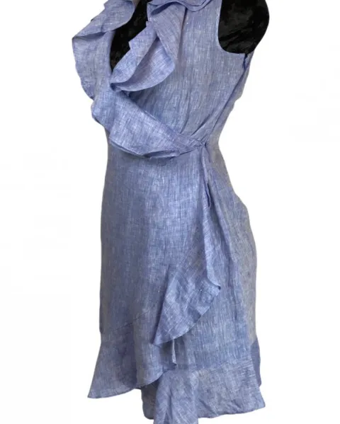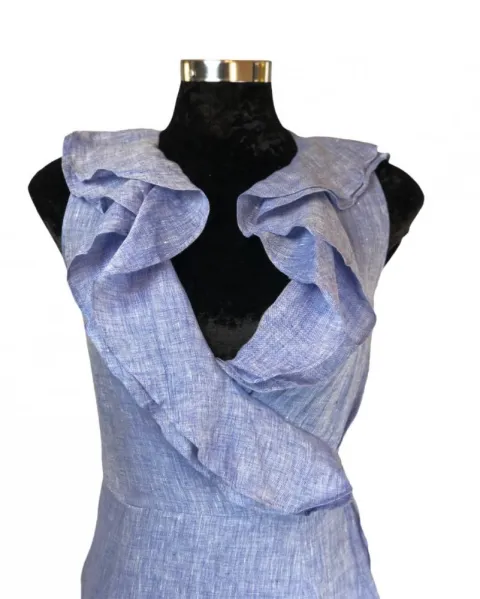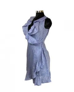 Vestido de lino Calvin Klein. Vestido en tela tipo lino azul jaspe con bellisimos detalles ondulados en en frente y a lo largo del vestido, es talla 2 o S de Calvin Klein.