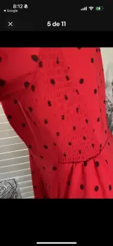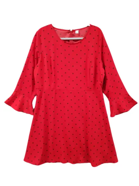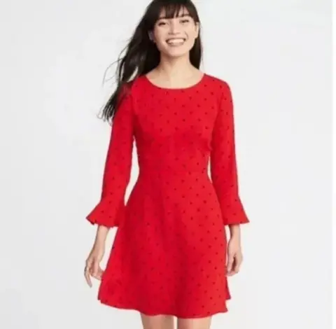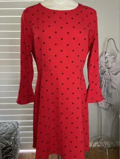 Vestido rojo de lunares negros Old Navy talla GCorte línea A, manga flauta acampanada detalle vistoso de crepé en elDorso del vestido.Súper en tendencia, clásico y juvenil a la vez