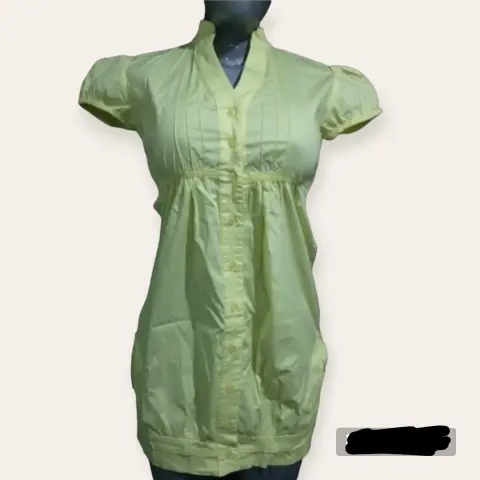 Vestido con botones al frente,de manga corta,color amarillo canario con bolsas á los costados,con cuello en V,el largo hasta las rodillas,talla M.