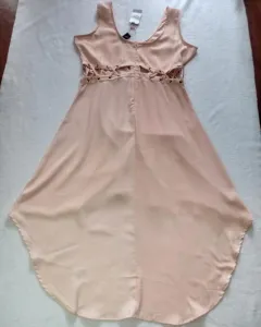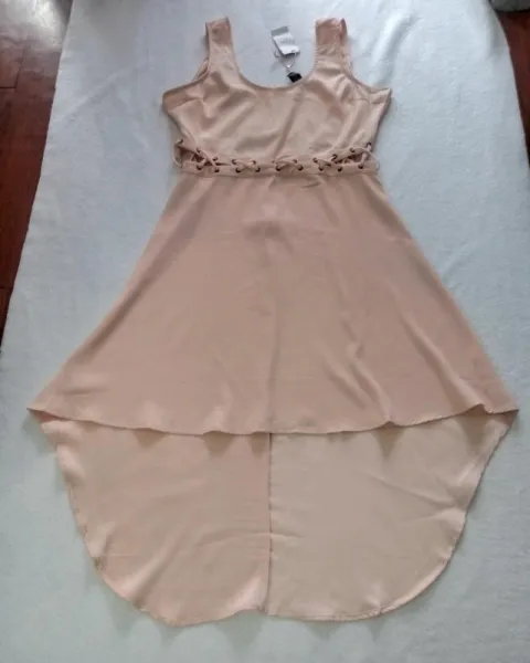 Vestido de marca americana. Vestido color melon es corto de adelante y mas largo de atras tiene cierre en la parte de atras mide alrededor de las axilas 96 cm