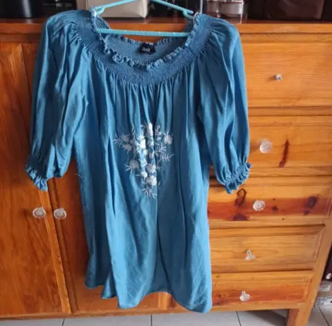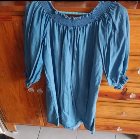Vestido de Mezclilla. Hermoso vestido de mezclilla delgada, con delicado bordado de flores al frente y hombros descubiertos