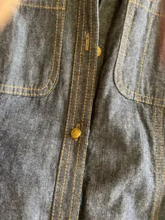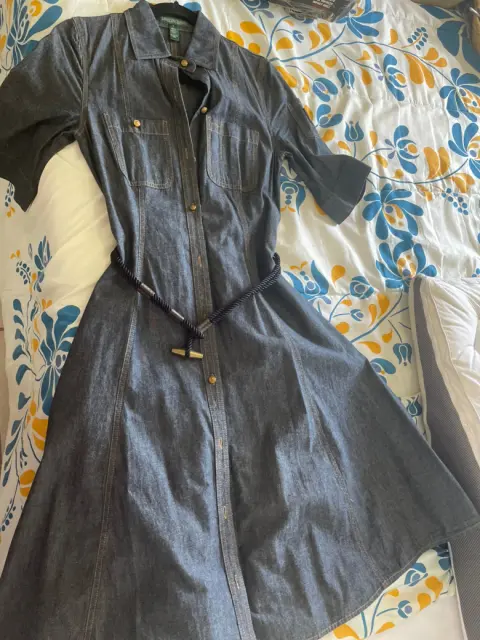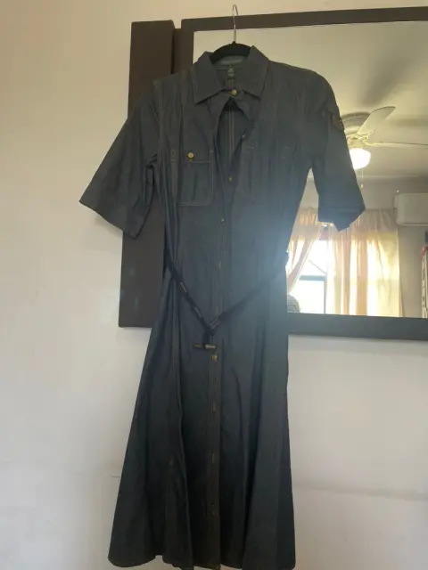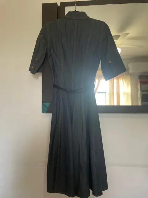 Mezclilla , color oscuro, nuevo,talla 4, vestido línea A. Con cinturón de cordón grueso color azul marino .