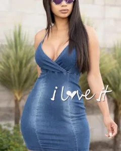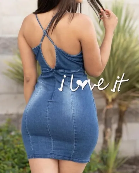 Hermoso vestido de mezclilla en cuello V con tirantes ajustables y estira un poco