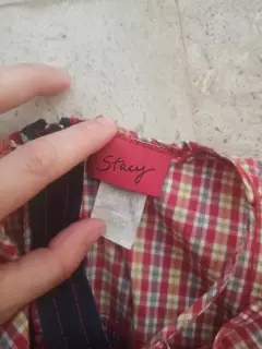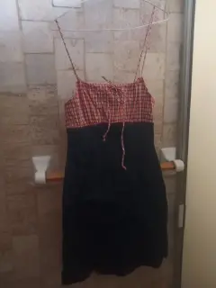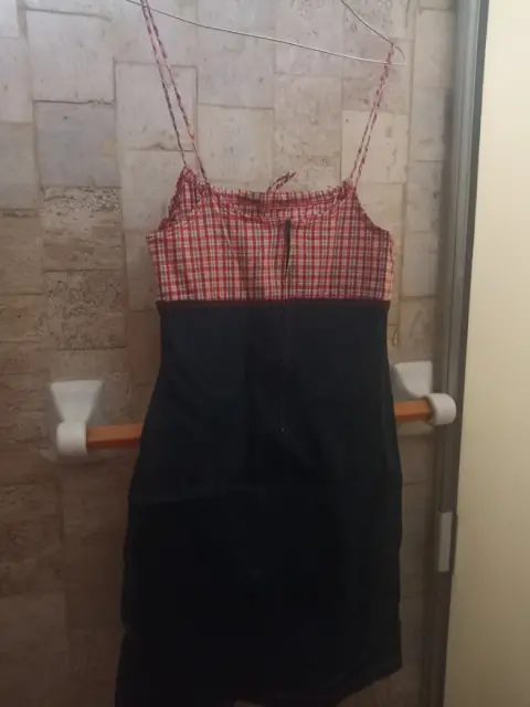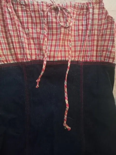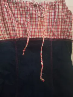 Vestido de mezclilla con cuadros amarillo con rojo en la parte superior, de tirantes y moño en la parte frontal . Llega a la rodilla