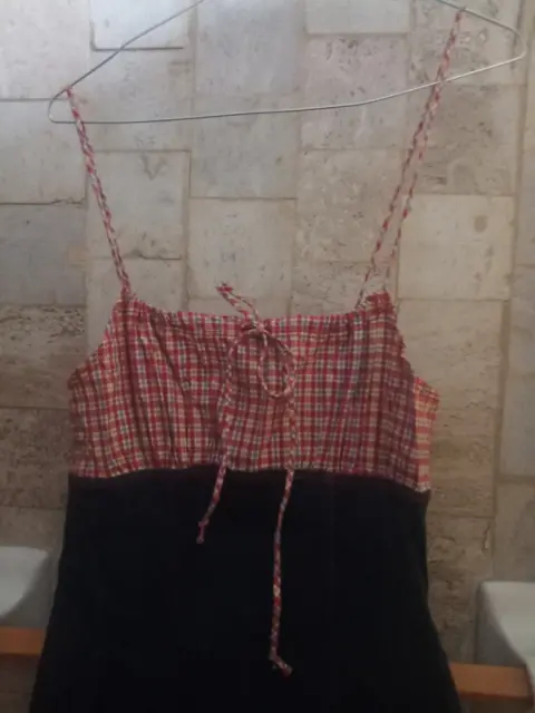Vestido de mezclilla con cuadros. Vestido de mezclilla con cuadros amarillo con rojo en la parte superior, de tirantes y moño en la parte frontal . Llega a la rodilla
