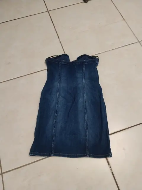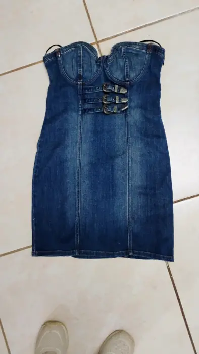 Vestido de mezclilla estraple. Hermoso vestido de mezclilla azul straple con cierre aún lado con detalles de ebillas enfrente .