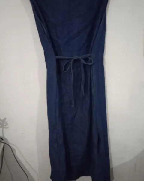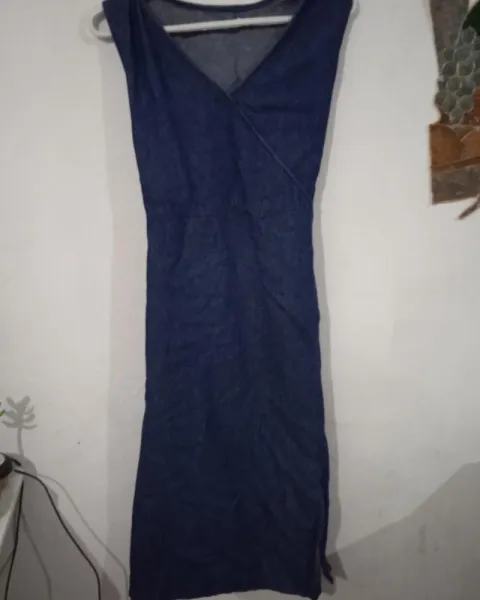 Es un vestido que puede usarse para embarazada o simplemente ajustarse a tu figura sin estarlo. Tiene abertura de un lado de la pierna y se amarra de atrás para dar forma. La mezclilla es gruesa.